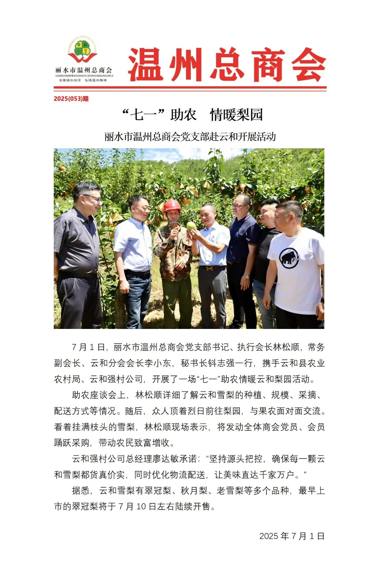 7月1日,丽水市温州总商会党支部书记、执行会长林松顺,常务副会长、云和分会会长李小东,秘书长钭志强一行,携手云和县农业农村局、云和强村公司,开展了一场“七一”助农情暖云和梨园活动。