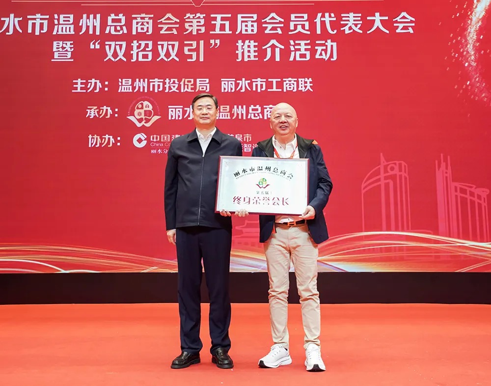 丽水市委常委、统战部长楼琅坚为丽水市温州总商会终身荣誉会长郑金林授牌