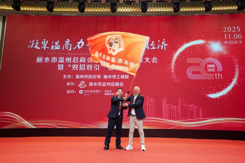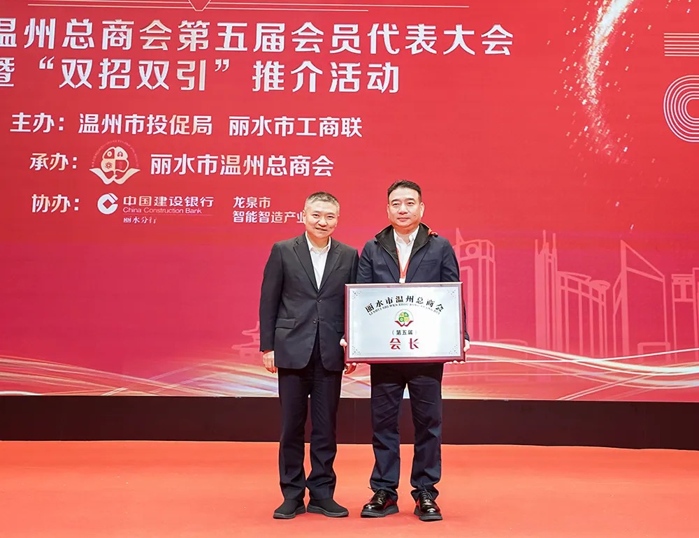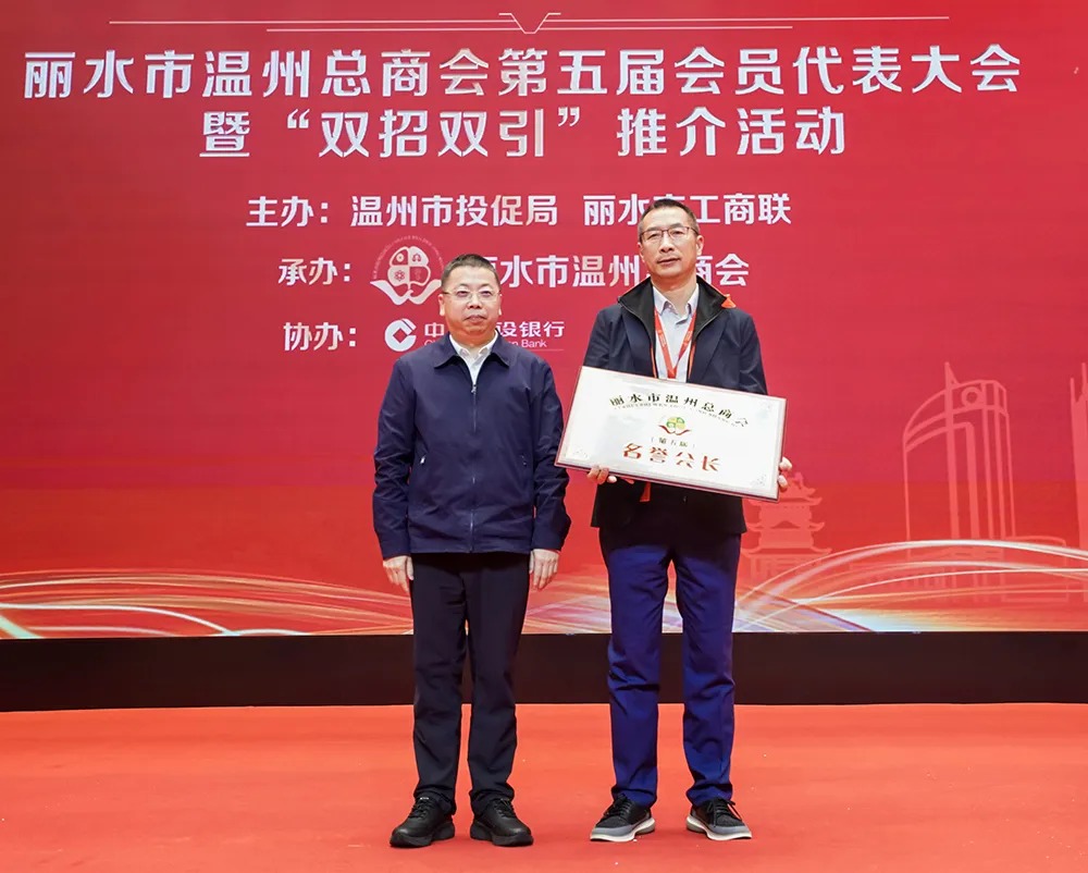 丽水市委副书记、市长朱林森为丽水市温州总商会第五届理事会会长叶福忠授牌