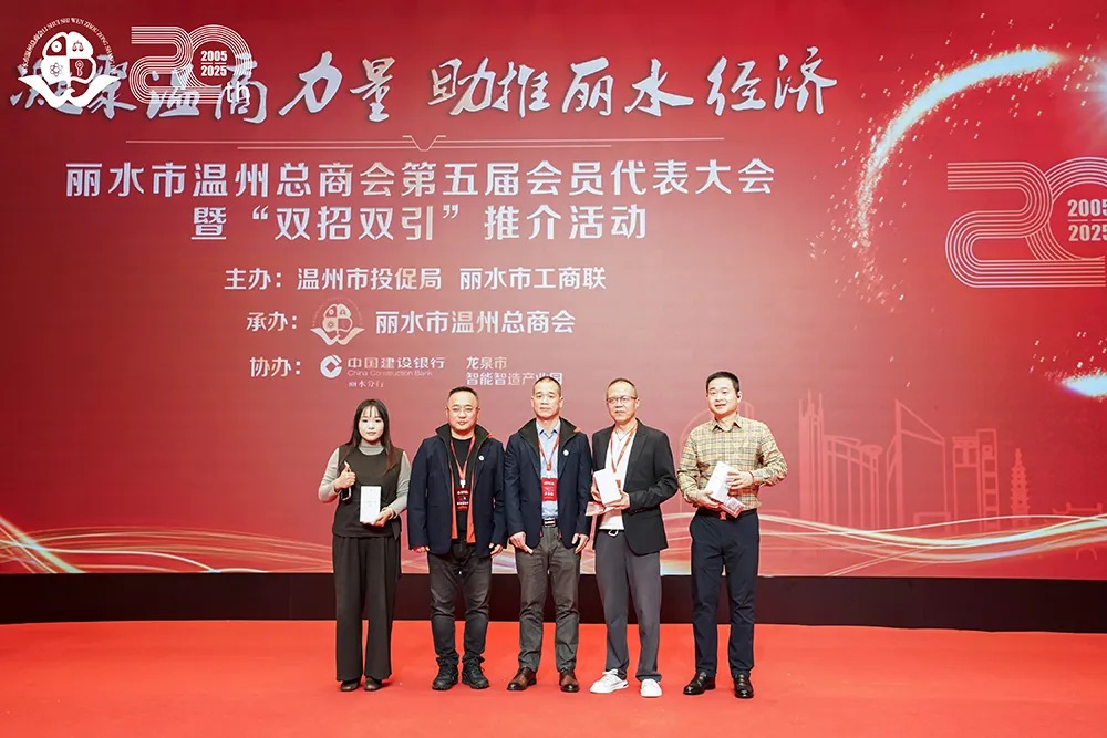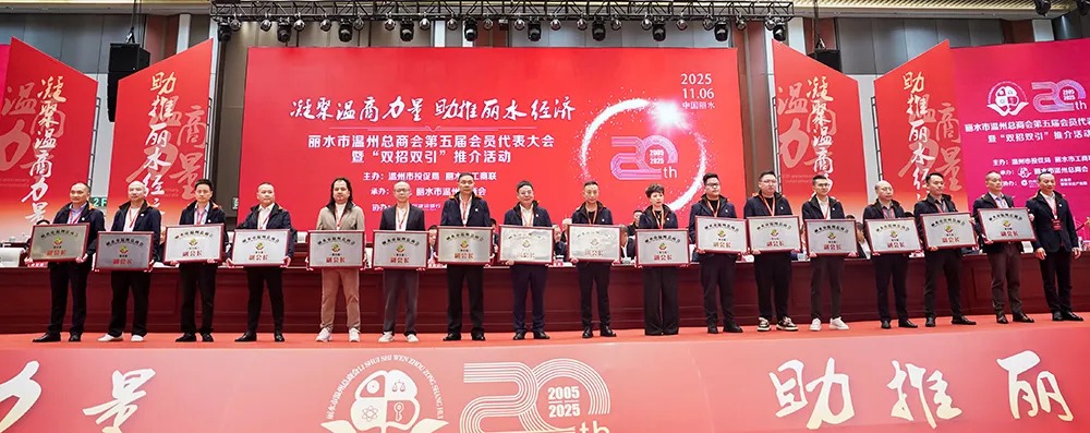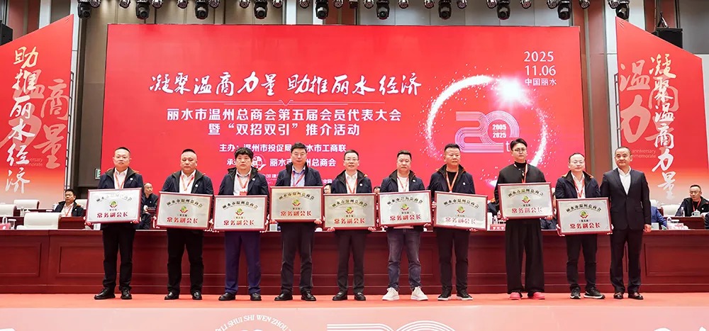丽水市温州总商会执行会长林冷双、李小东、姜振青、林光友、南存鹤为温商新生代联合会副会长周士森、潘正超、林思程、朱章仁、郑林伟、张杰授牌。