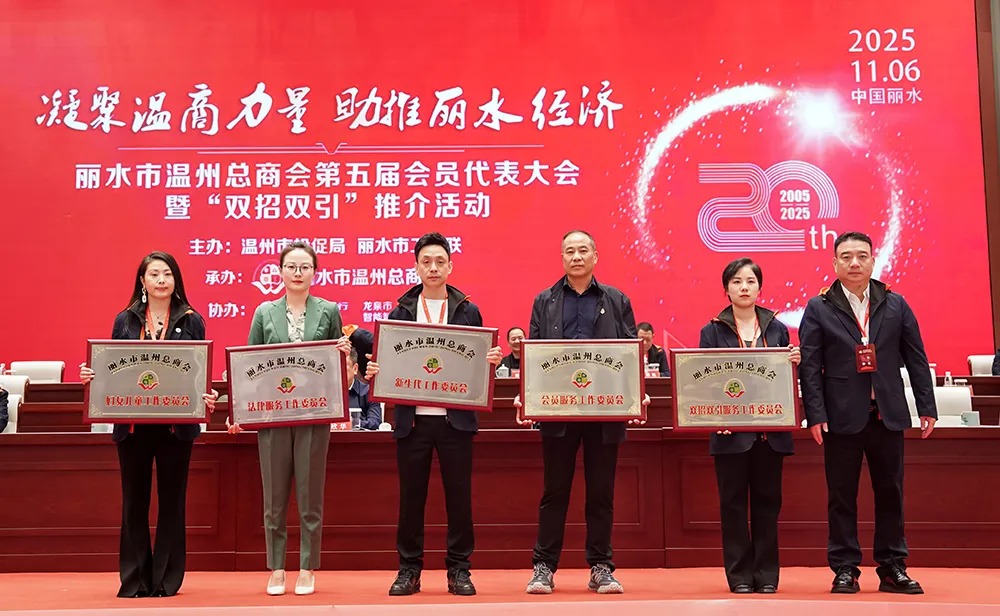 丽水市温州总商会会长叶福忠为会员服务工作委员会主任王品淮、妇女儿童工作委员会主任张晓珍、法律服务工作委员会主任李欣、双招双引工作委员会主任林康乐、新生代工作委员会主任张云授牌。
