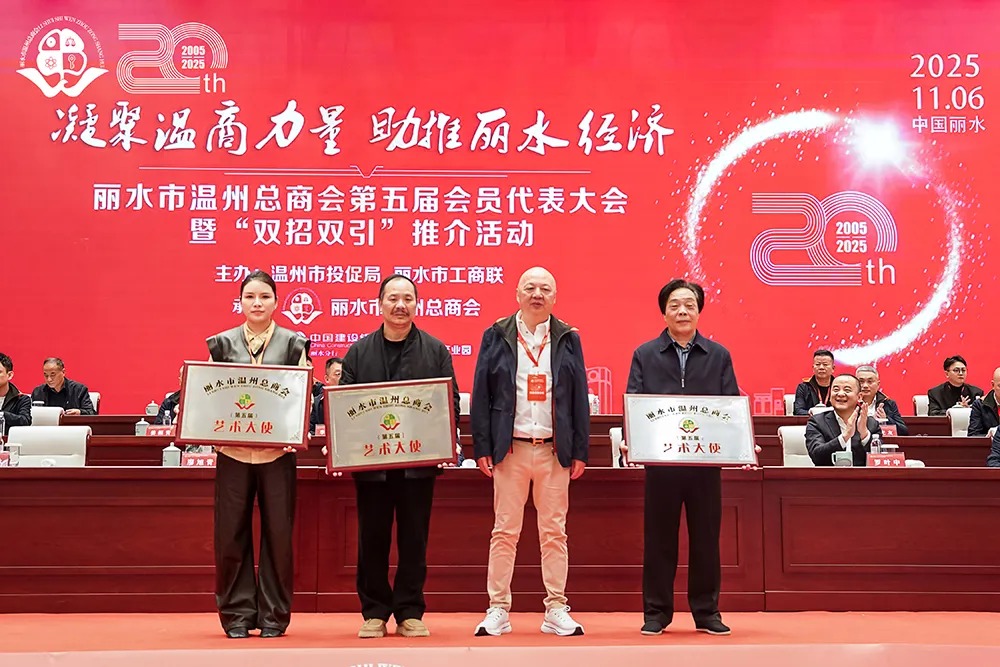 丽水市温州总商会终身荣誉会长郑金林为文化艺术大使:中国陶瓷艺术大师徐定昌、中国工艺美术大师潘成松、中国工艺美术大师陈阿金(代表)颁发聘书。