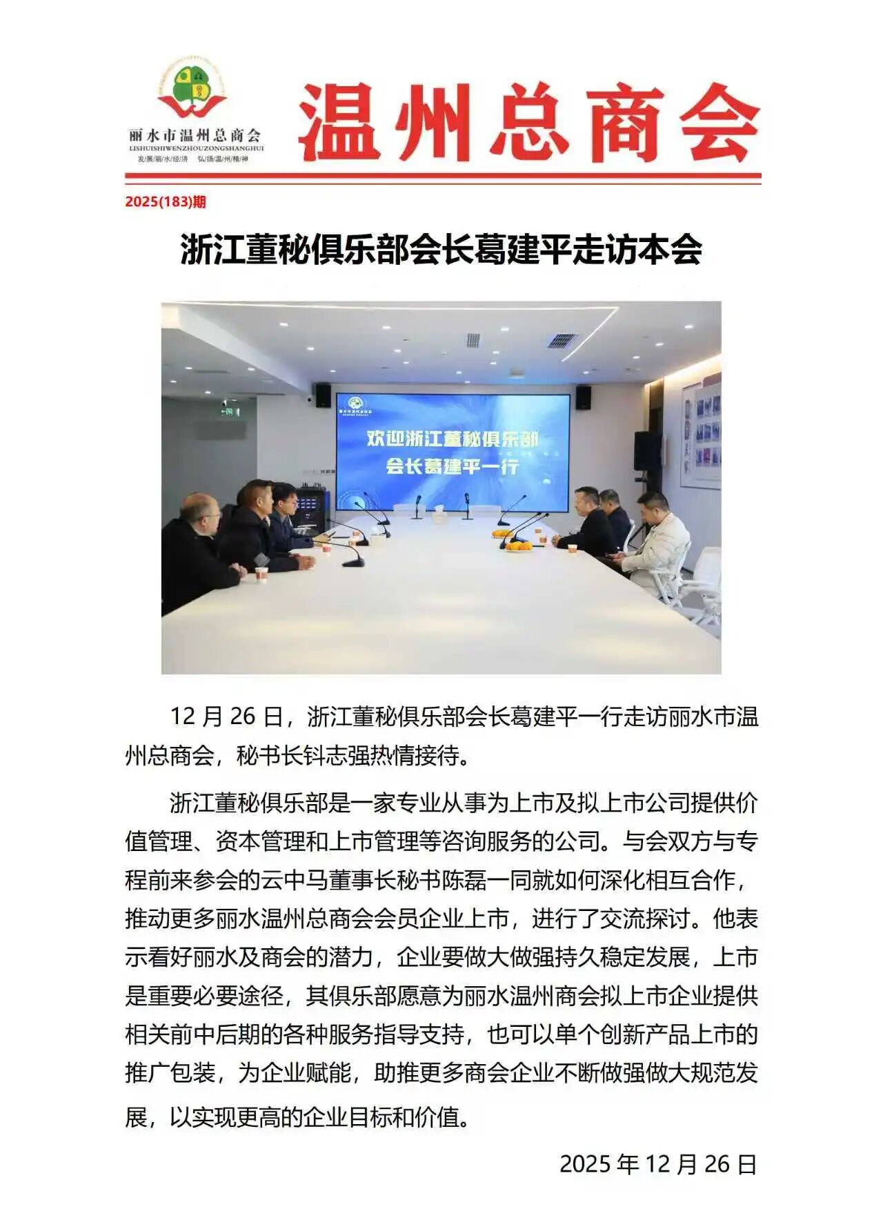 12月26日,浙江董秘俱乐部会长葛建平一行走访丽水市温州总商会,秘书长钭志强热情接待。